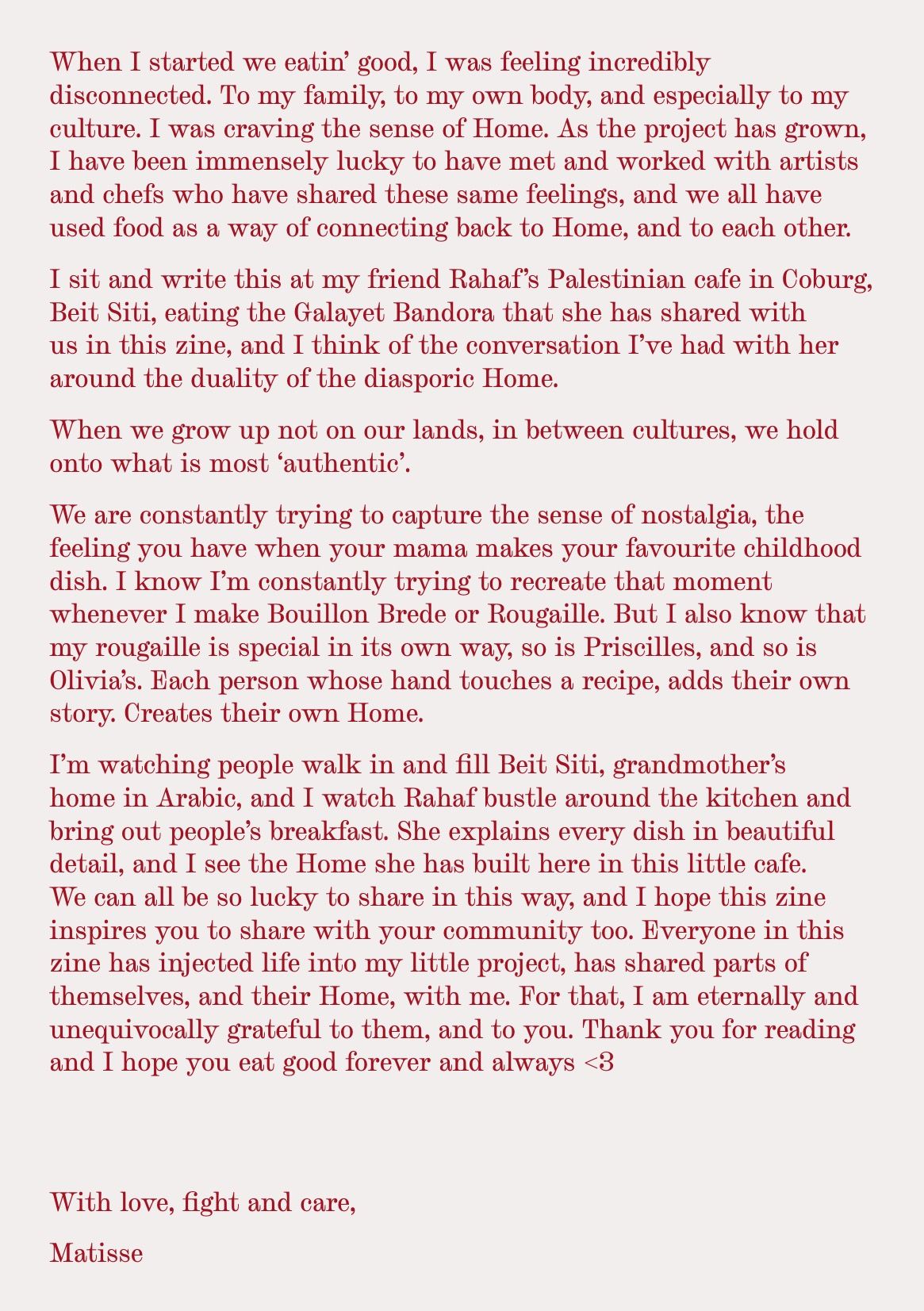 We Eatin’ Good! pictured is a collaborative food and cooking platform dedicated to amplifying young Queer, Black, Indigenous and People of Colour. Created by Matisse Laida, who works closely with Nisha Hunter, this platform engages with QPoC across the world and holds space for the community to share and consume a range of cooking practices, culture and knowledge in a safe and celebratory way.